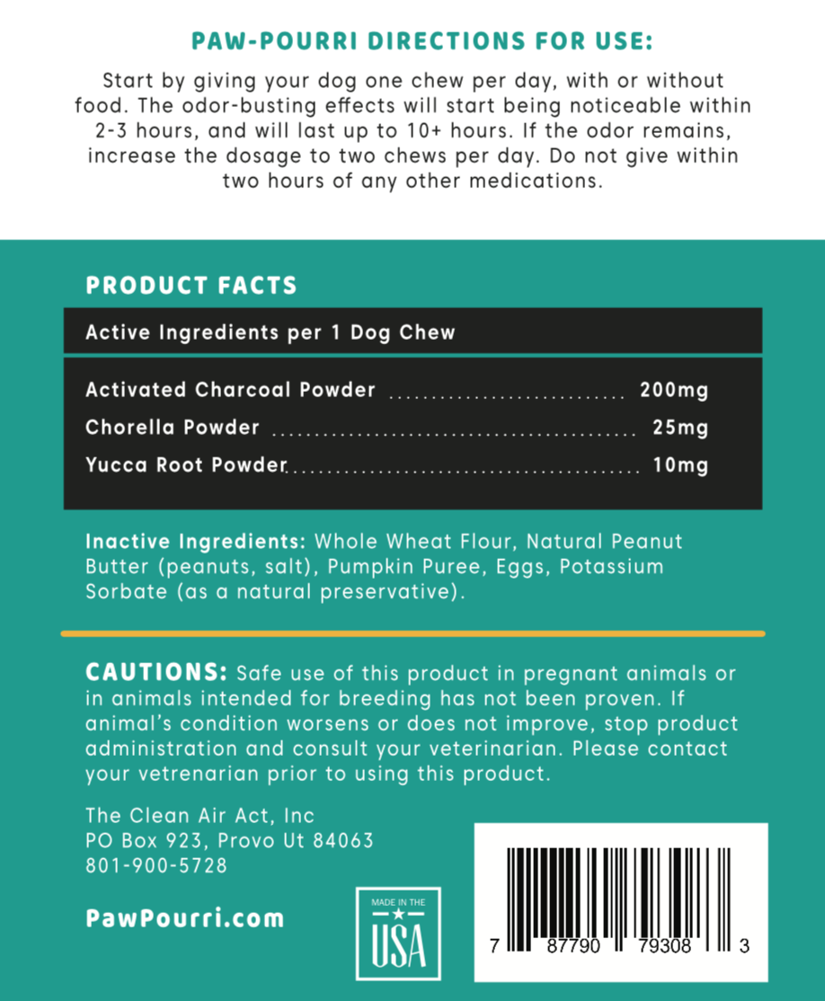 1 Paw-Pourri chew will be enough for most dogs. Larger dogs may need 1-2 chews to freshen up their gas.